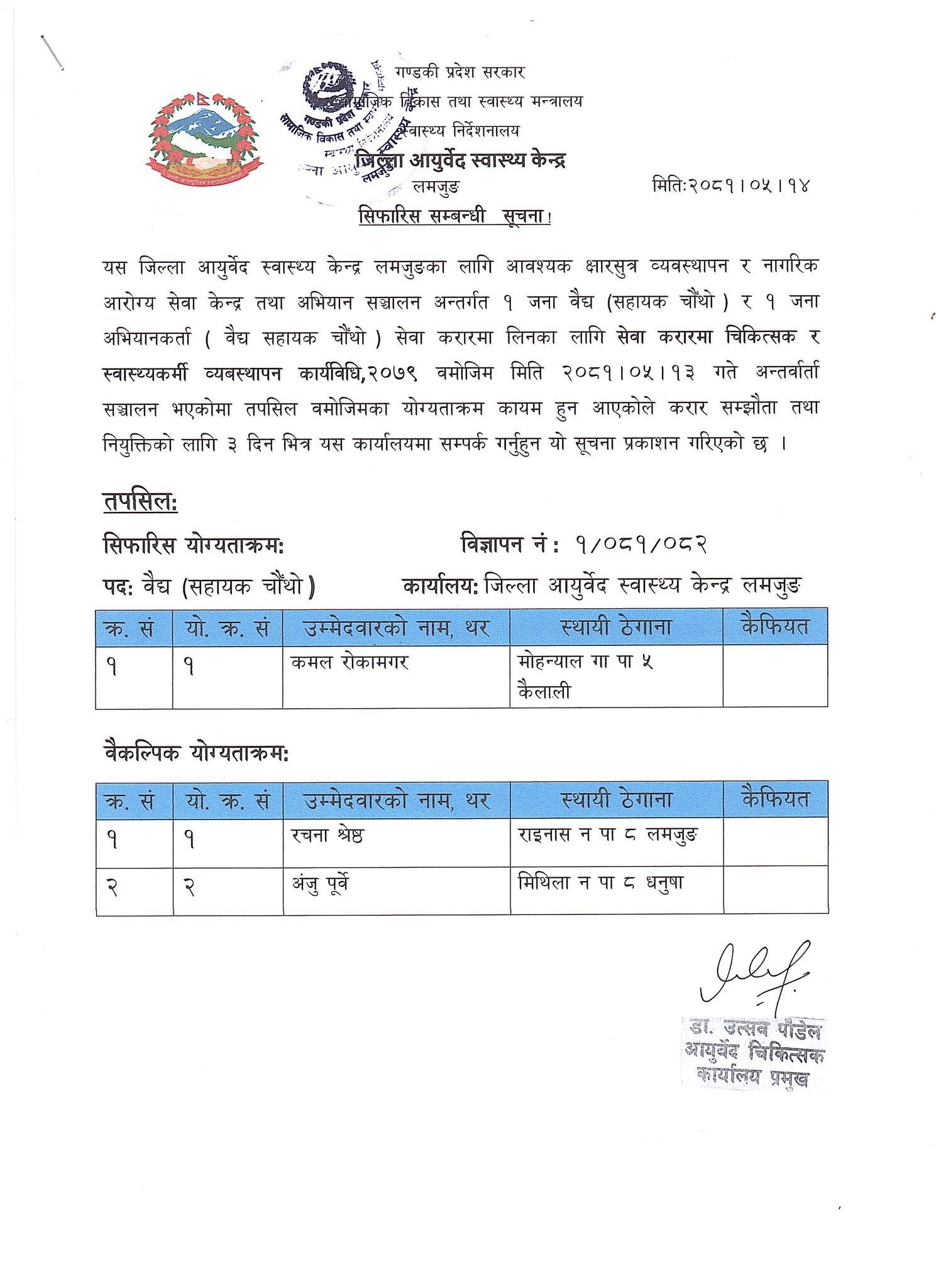 Download: क्षारसुत्र व्यवस्थापन कार्यक्रम अन्तर्गत बैद्य पदको सिफारिस सम्बन्धी सूचना ।